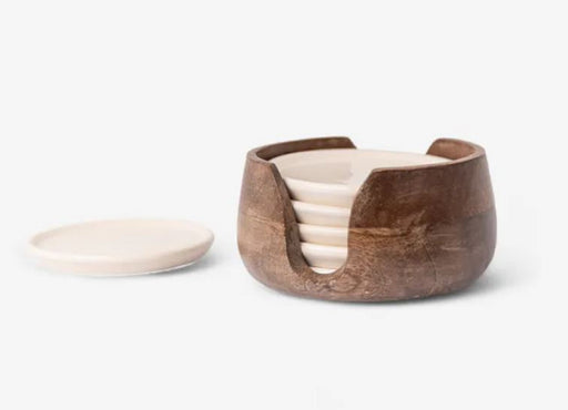 With smooth porcelain surfaces nestled inside a warm wooden holder, this coaster set offers a beautiful balance of function and form. The soft c...