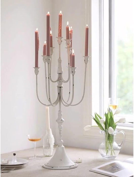 This candle holder is made of metal, sturdy and durable, hand polished and finished with a high quality paint to prevent rust; the base is sturdy and stable. The Table candle holder is vintage in style, with a deliberate 'old colour' surface to mimic the signs of age and add an old-fashioned charm. The extra large candle holder with 11 arms, high and low, and a little candle light, creates a different visual effect.